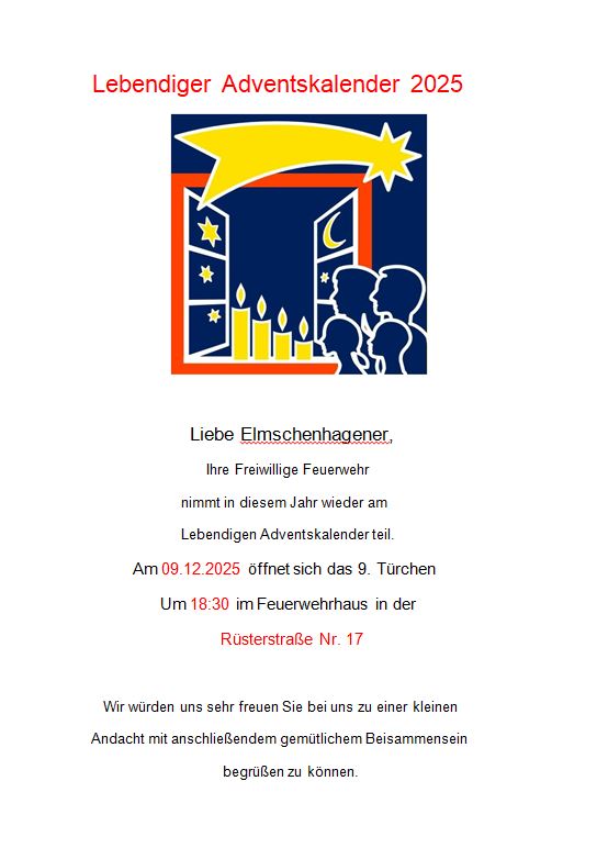 Am 09.12.2025 ist es wieder soweit! Auch dieses Jahr öffnet sich an unserem Gerätehaus ein Türchen, diesmal das 9. um 18:30 in der Rüsterstraße 17. Nach einer kleinen Andacht können wir anschließendem ein gemütliches Beisammenseins genießen. Kommen Sie zu dieser besinnlichen Zeit doch vorbei. Wir freuen uns, bis dahin!